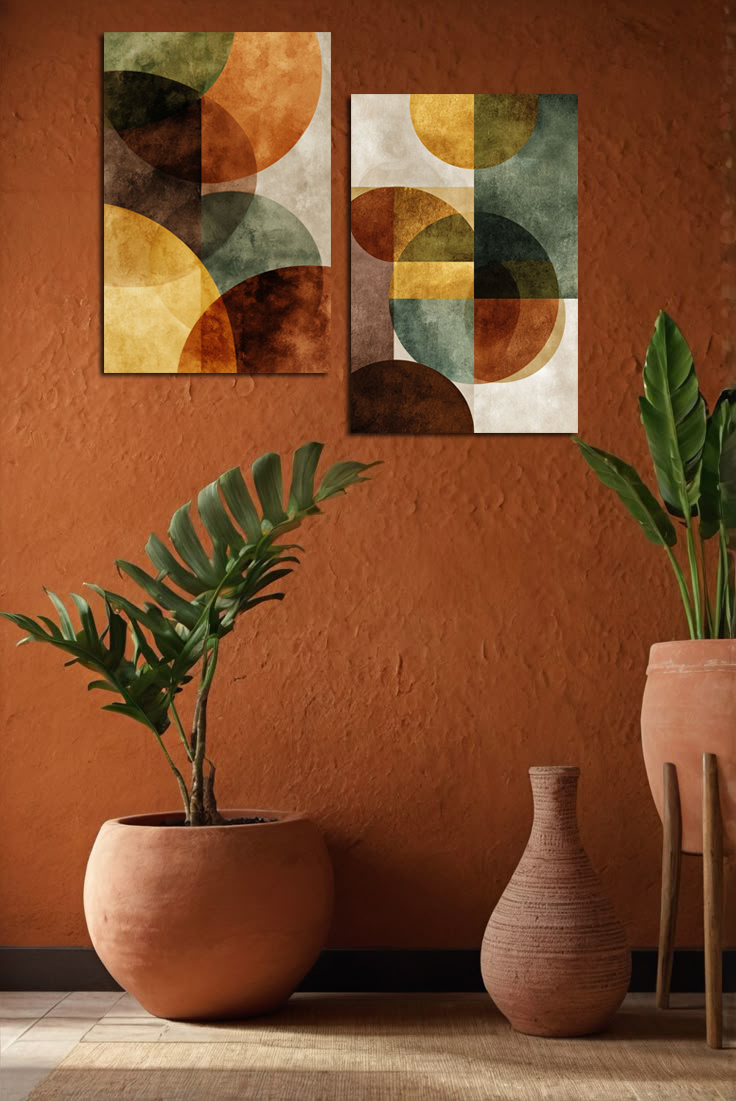 A stylish 2-piece wall art set combining abstract shapes with modern botanical elements in warm earthy tones. Perfect for adding a cozy, contemporary touch to living rooms, hallways, and modern interiors.