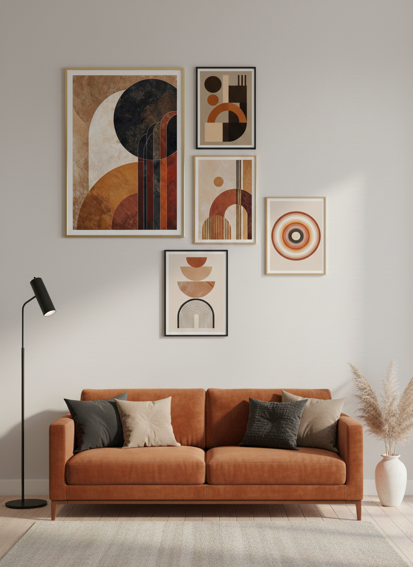 A stylish 3-piece geometric wall art set featuring warm earthy tones and clean abstract lines. Perfect for modern living rooms, Scandinavian décor, and minimalist interiors.