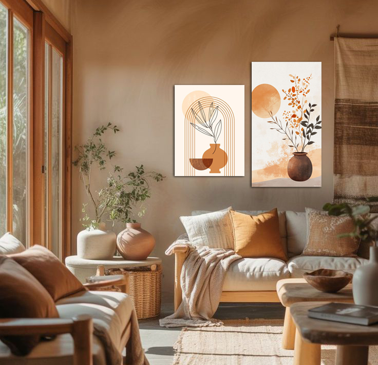 A warm and modern boho wall art collection featuring abstract shapes, botanical elements, and earthy tones. Perfect for creating a stylish gallery wall in living rooms, hallways, and cozy interiors.